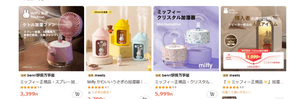 3.ミッフィーの加湿器:かわいいうさぎのデザインで、ナイトライト機能付きの380ml大容量加湿器です。テーブル装飾にもなり、人気の商品です。