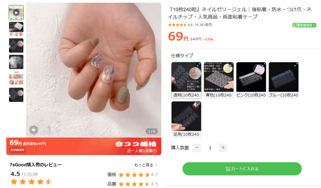 2.ネイルゼリージェル(10枚240粒):強粘着・防水仕様のネイルチップ用両面粘着テープです。つけ爪の固定に最適で、多くのユーザーに支持されています。